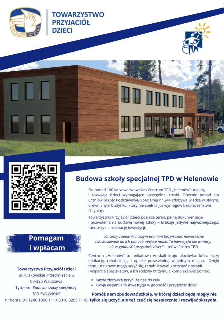 W imieniu Grzegorza Piestraka Prezesa ZG TPD informujemy, że ruszyła zbiórka publiczna na rzecz budowy nowego budynku Szkoły Podstawowej Specjalnej w Centrum TPD „Helenów” w Warszawie.