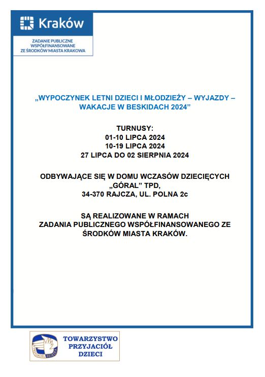 Organizujemy ciekawe formy wypoczynku wakacyjnego i zimowego dla dzieci i młodzieży poza miejscem zamieszkania, a także turnusy kształtująco-usprawniające w naszym Domu Wczasów Dziecięcych „Góral” TPD w Rajczy, który podlega całorocznemu dozorowi Kuratorium Oświaty. Są to kilku lub kilkunastodniowe kolonie, obozy i zimowiska rekreacyjno-wypoczynkowe i tematyczne oraz turnusy kształtująco-usprawniające w okresie wakacyjnym oraz feryjnym w DWD „Góral” w Rajczy, w atrakcyjnych miejscach turystycznych zarówno w Polsce, jak i za granicą.