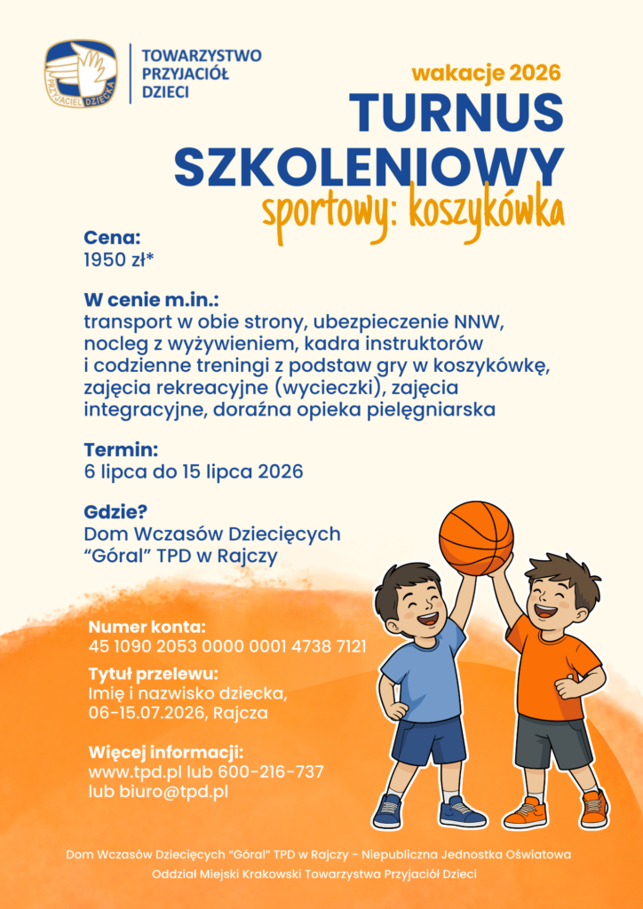 Organizujemy ciekawe formy wypoczynku wakacyjnego i zimowego dla dzieci i młodzieży poza miejscem zamieszkania, a także turnusy edukacyjne (kształtująco-usprawniające) w naszym Domu Wczasów Dziecięcych „Góral” TPD w Rajczy, który podlega całorocznemu dozorowi Kuratorium Oświaty. Są to kilku lub kilkunastodniowe kolonie, obozy i zimowiska rekreacyjno-wypoczynkowe i tematyczne oraz turnusy kształtująco-usprawniające w okresie wakacyjnym oraz feryjnym w DWD „Góral” w Rajczy, w atrakcyjnych miejscach turystycznych zarówno w Polsce, jak i za granicą.